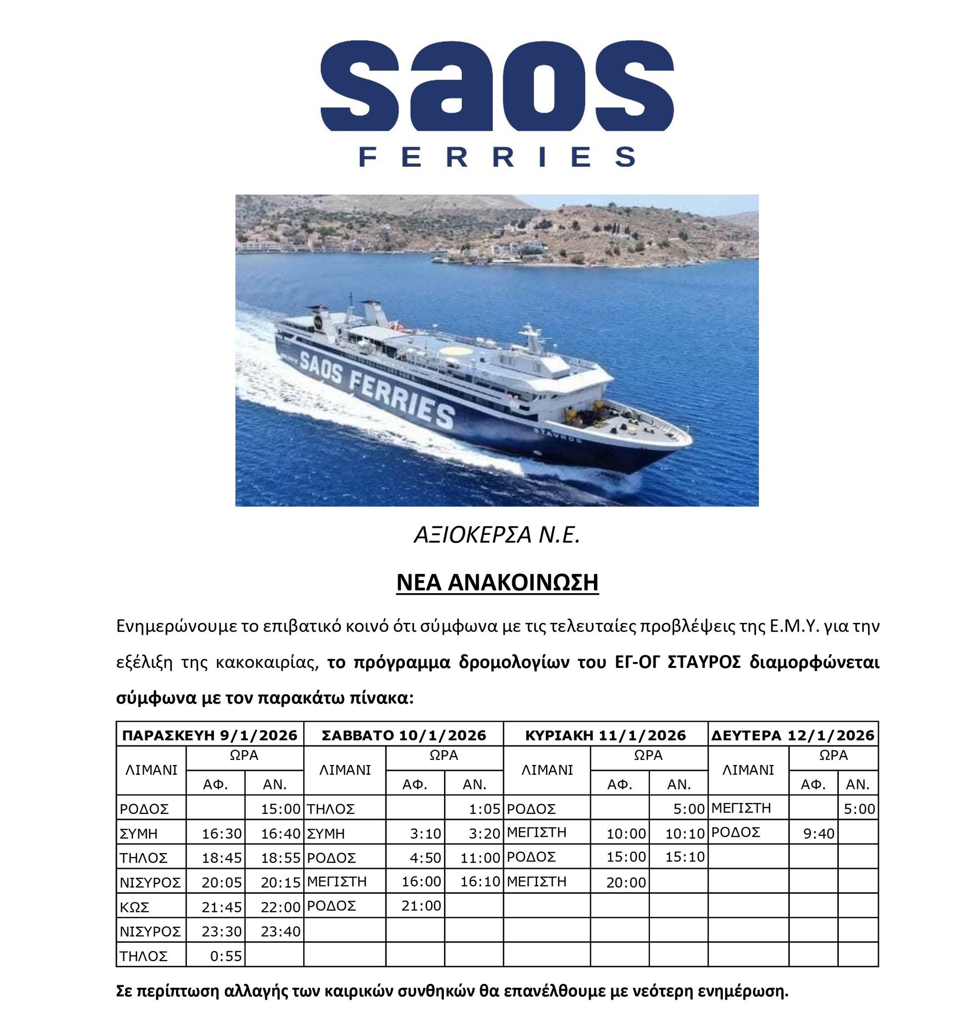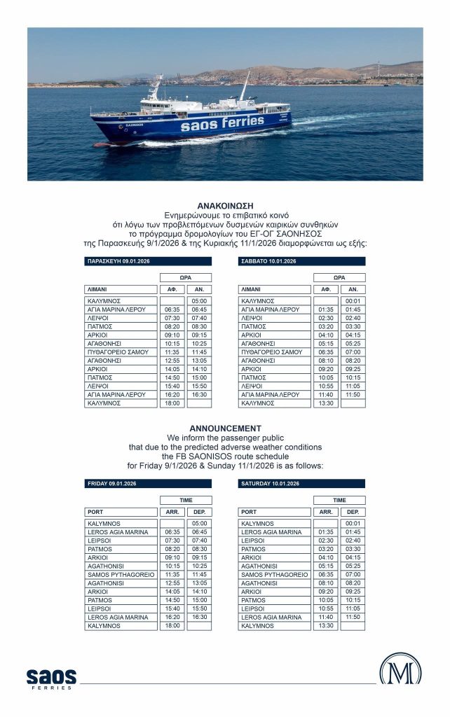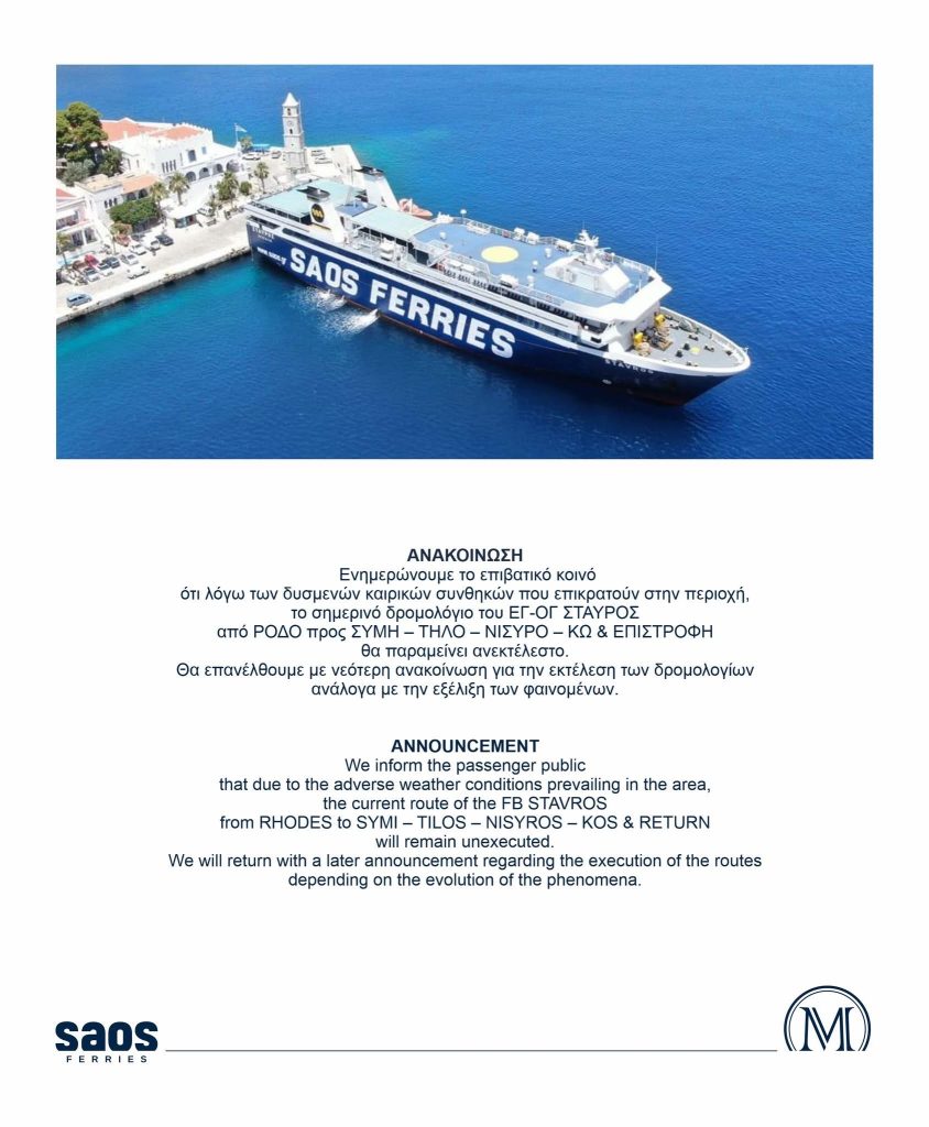 Η SAOS FERRIES ενημερώνει το επιβατικό κοινό για τροποποιήσεις στα δρομολόγια του Ε/Γ-Ο/Γ ΣΤΑΥΡΟΣ και του Ε/Γ-Ο/Γ ΣΑΟΝΗΣΟΣ, λόγω δυσμενών καιρικών συνθηκών.