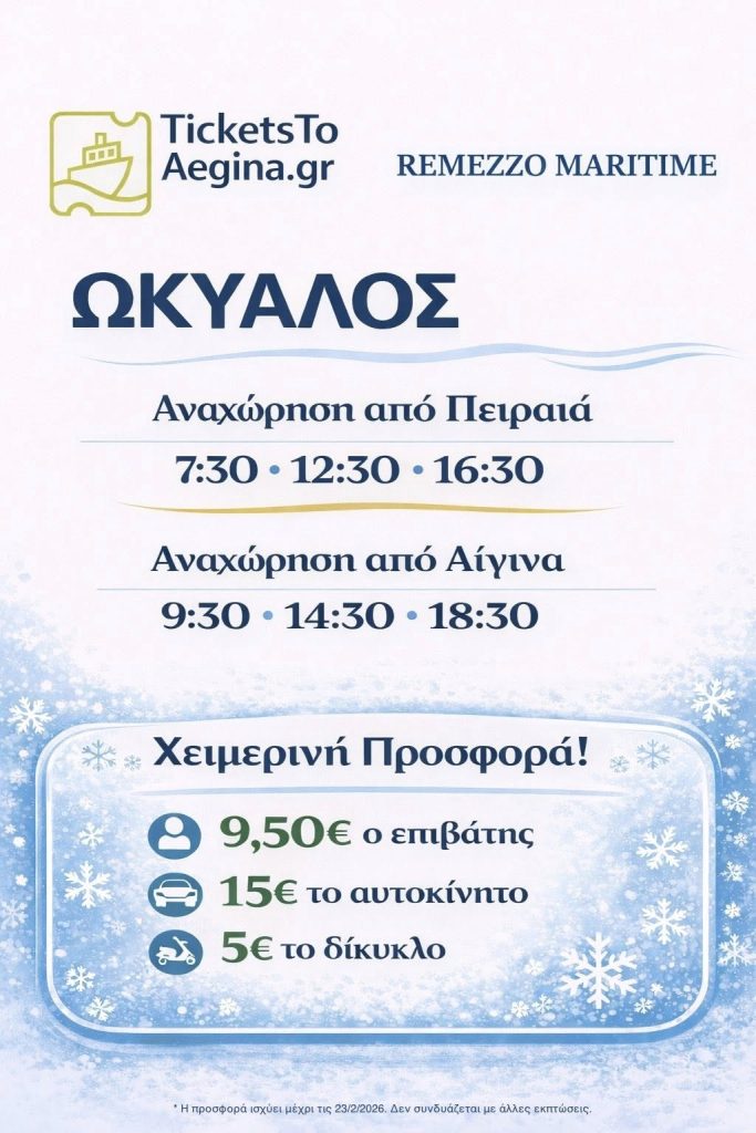 Η REMEZZO MARITIME προσφέρει για ταξίδια με το ΩΚΥΑΛΟΣ, ειδικές χειμερινές τιμές για τα δρομολόγια Πειραιάς – Αίγινα και Αίγινα – Πειραιάς.