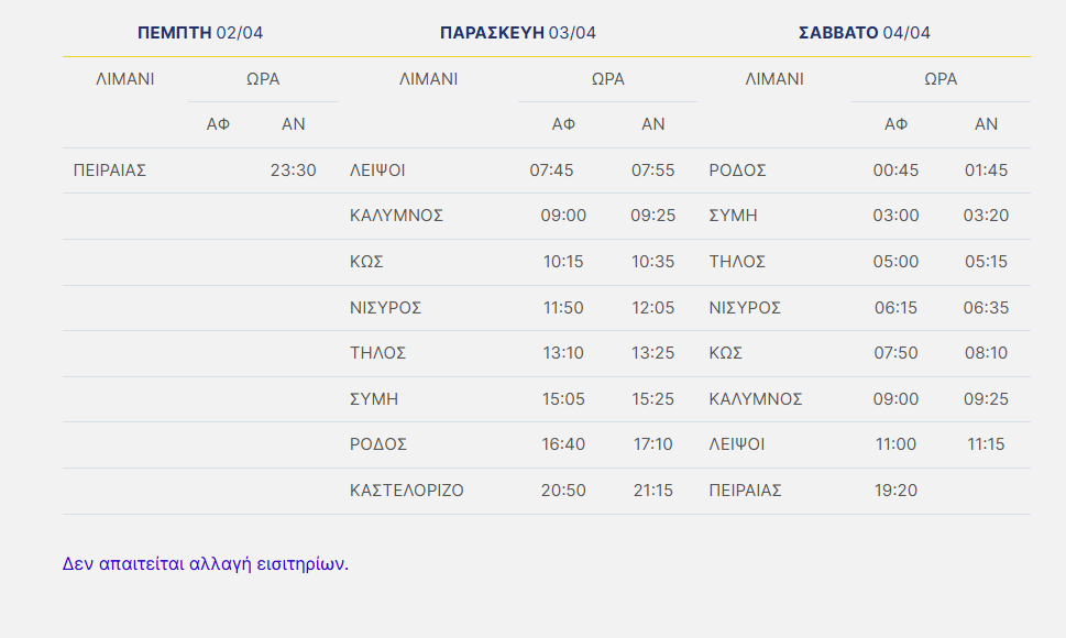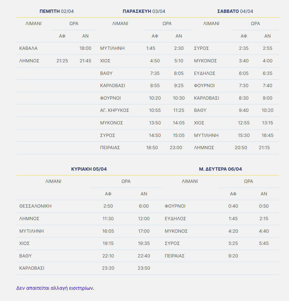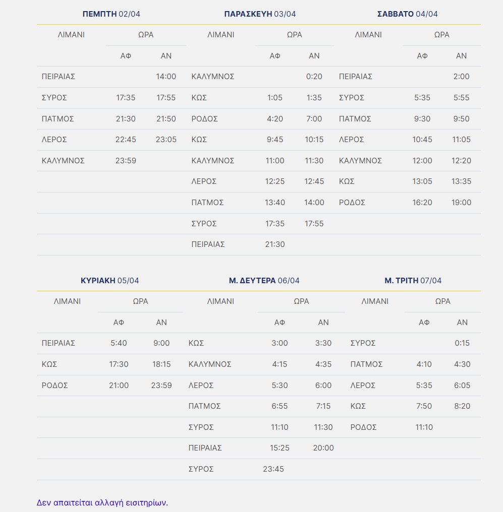Τα δρομολόγια του πλοίου από την Πέμπτη 02/04/2026 έως την Μ. Δευτέρα 06/04/2026, θα εκτελεσθούν σύμφωνα με τον επισυναπτόμενο πίνακα δρομολογίων: