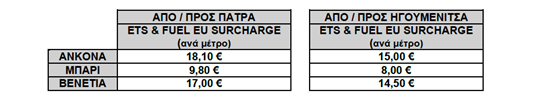 Από την 11η Ιανουαρίου 2026 ισχύει η επιβάρυνση «ETS & FUEL EU SURCHARGE» στα εισιτήρια φορτηγών οχημάτων, ανά διαδρομή, στις γραμμές Αδριατικής και διαμορφώνεται ως κάτωθι: