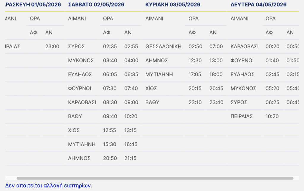 Παρασκευή 01/05/2026: Το πλοίο θα αναχωρήσει από Μυτιλήνη στις 23:59, για: