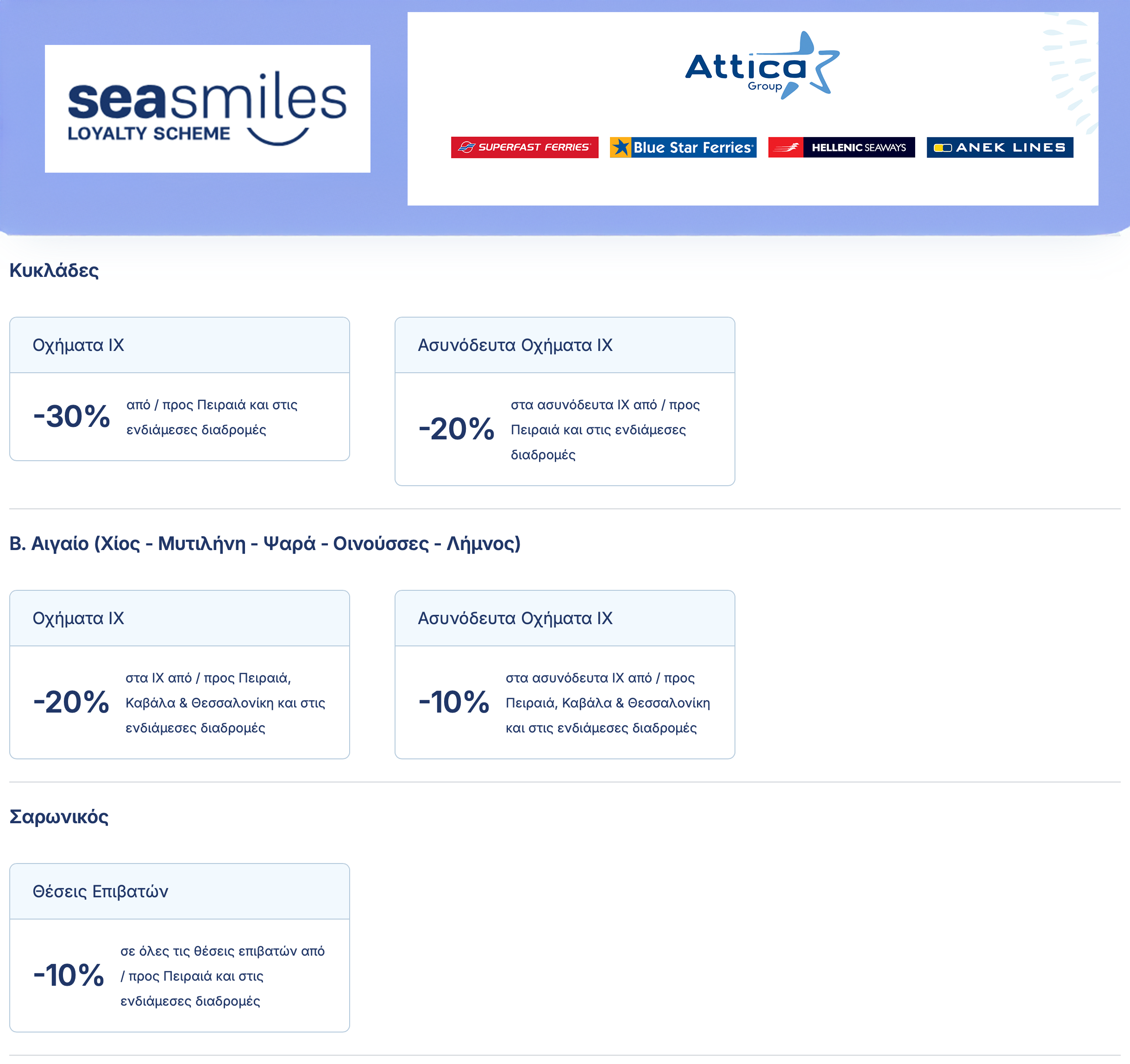 Σε μειώσεις στα ποσοστά εκπτώσεων που έχουν οι κάτοχοι της loyalty card του ομίλου, την SEASMILES, προχώρησε η ATTICA GROUP, ανεβάζοντας εμμέσως τις τιμές των εισιτηρίων σε ορισμένους προορισμούς, αφού με τη μείωση της έκπτωσης ο κάτοχος της κάρτας θα πληρώνει σημαντικά παραπάνω ναύλο ανά διαδρομή.