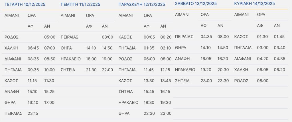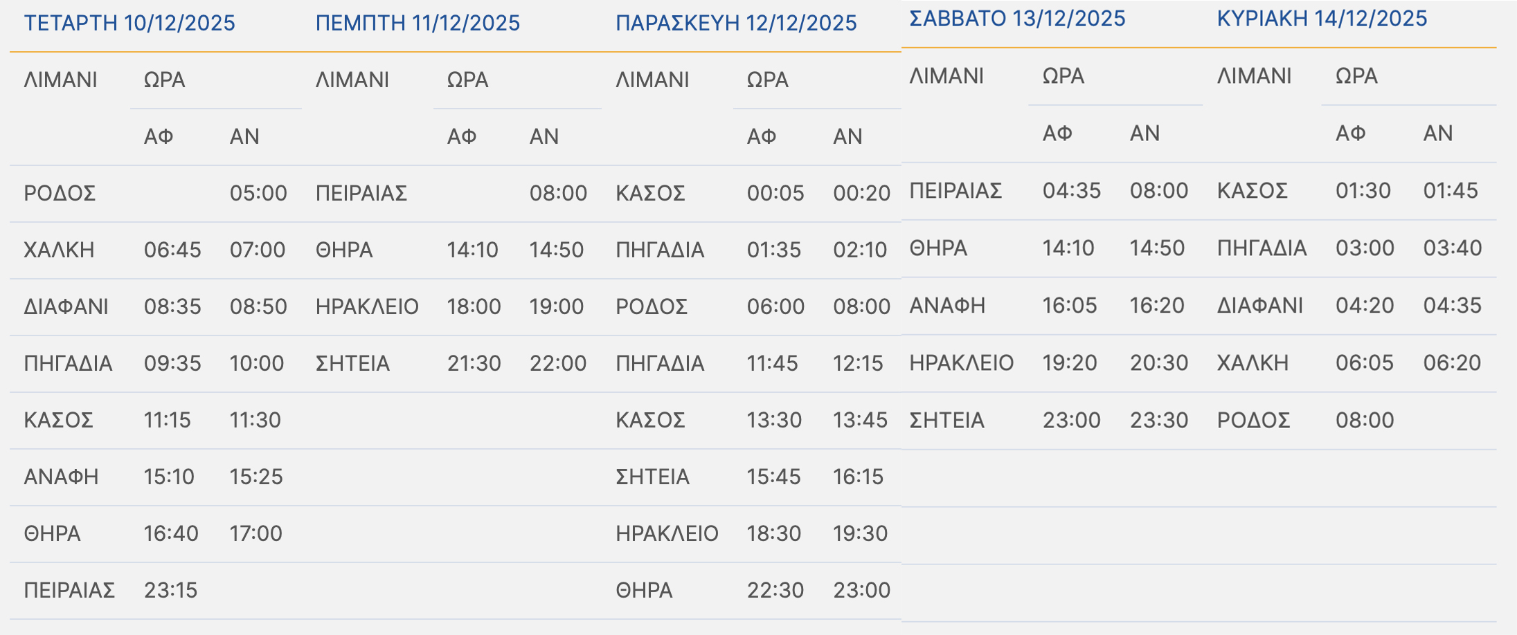 Το πλοίο θα παραμείνει στο λιμάνι της Ρόδου την Τρίτη 09/12/2025 και εφόσον οι καιρικές συνθήκες βελτιωθούν θα αναχωρήσει αύριο Τετάρτη 10/12/2025 στις 05:00, με το πρόγραμμα δρομολογίων του μέχρι και την Κυριακή 14/12/2025 να τροποποιείται σύμφωνα με τον παρακάτω πίνακα: