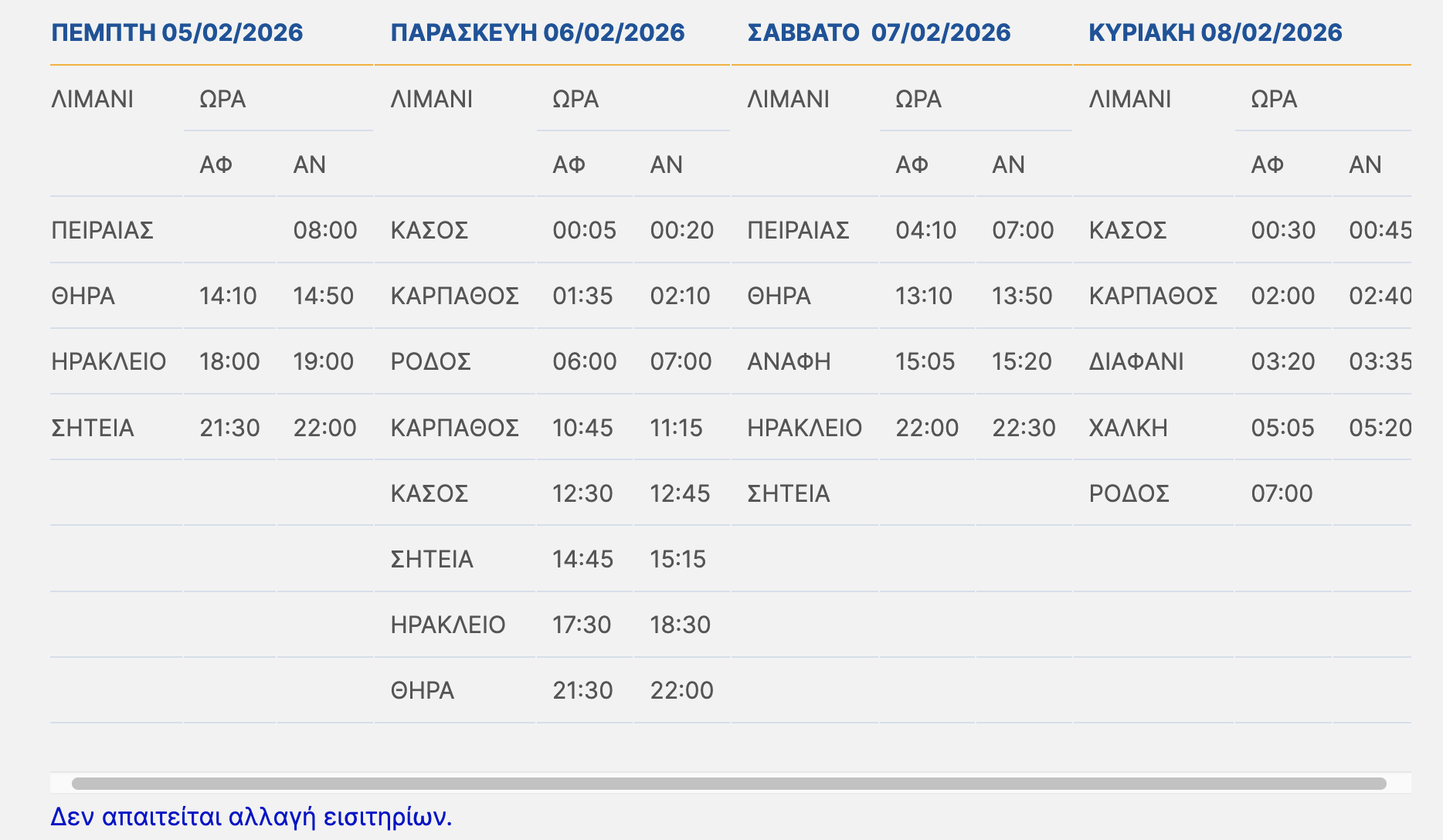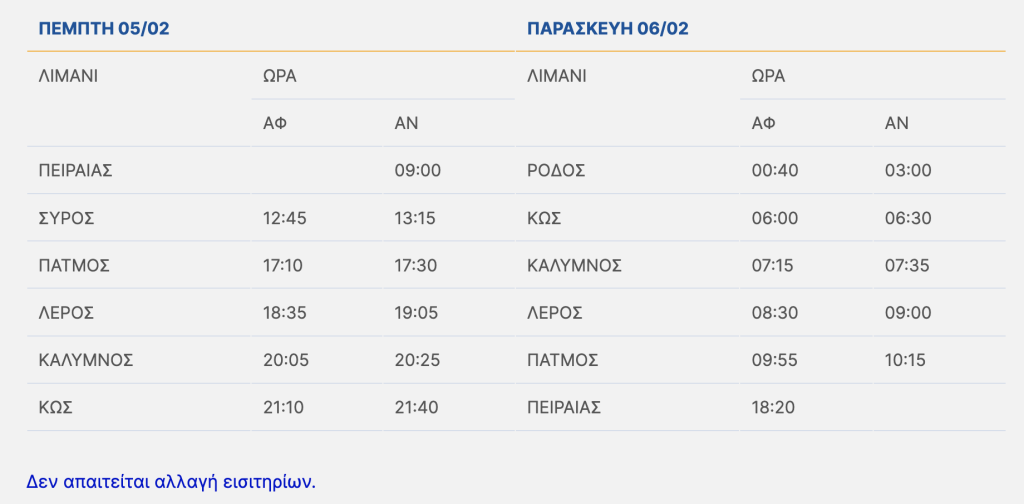 Τετάρτη 04/02/2026: Τα δρομολόγια του πλοίου θα πραγματοποιηθούν ως ακολούθως :