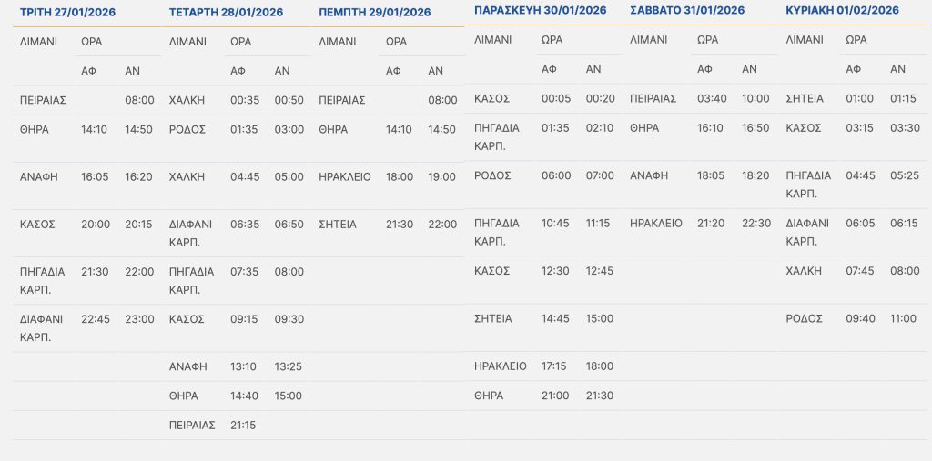Το πλοίο θα παραμείνει στο λιμάνι του Πειραιά τη Δευτέρα 26/01/2026, από όπου και θα αναχωρήσει την Τρίτη 27/01/2026, ως ακολούθως :