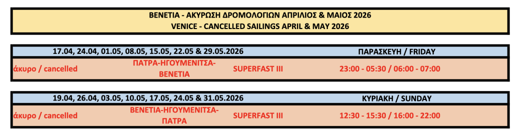 Ενημέρωση από την SUPERFAST FERRIES σχετικά με την ακύρωση ορισμένων δρομολογίων στη γραμμή της Βενετίας με το SUPERFAST III, για το διάστημα από 17.04 έως 31.05.2026.