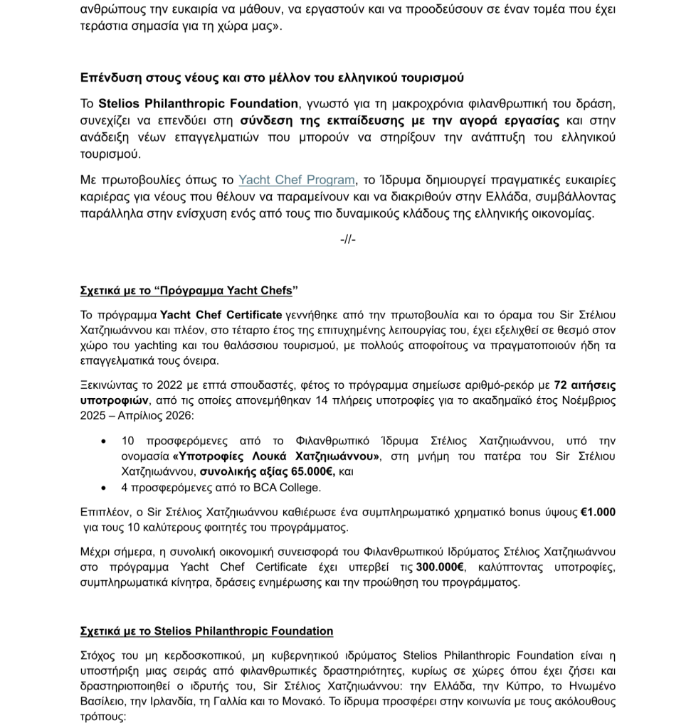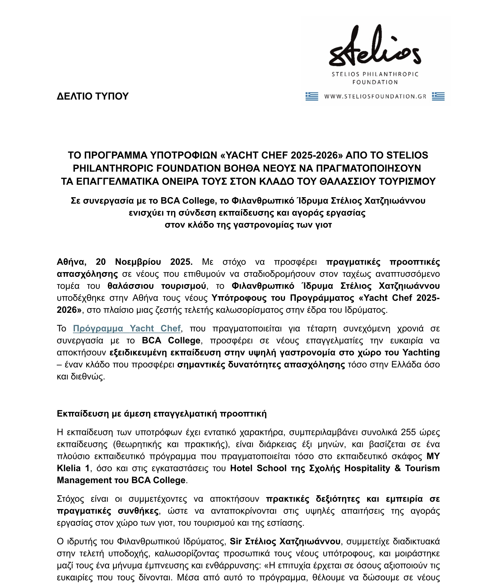 Yacht Chef 25-26: Πρόγραμμα υποτροφιών από το Ίδρυμα Στέλιος Χατζηιωάννου